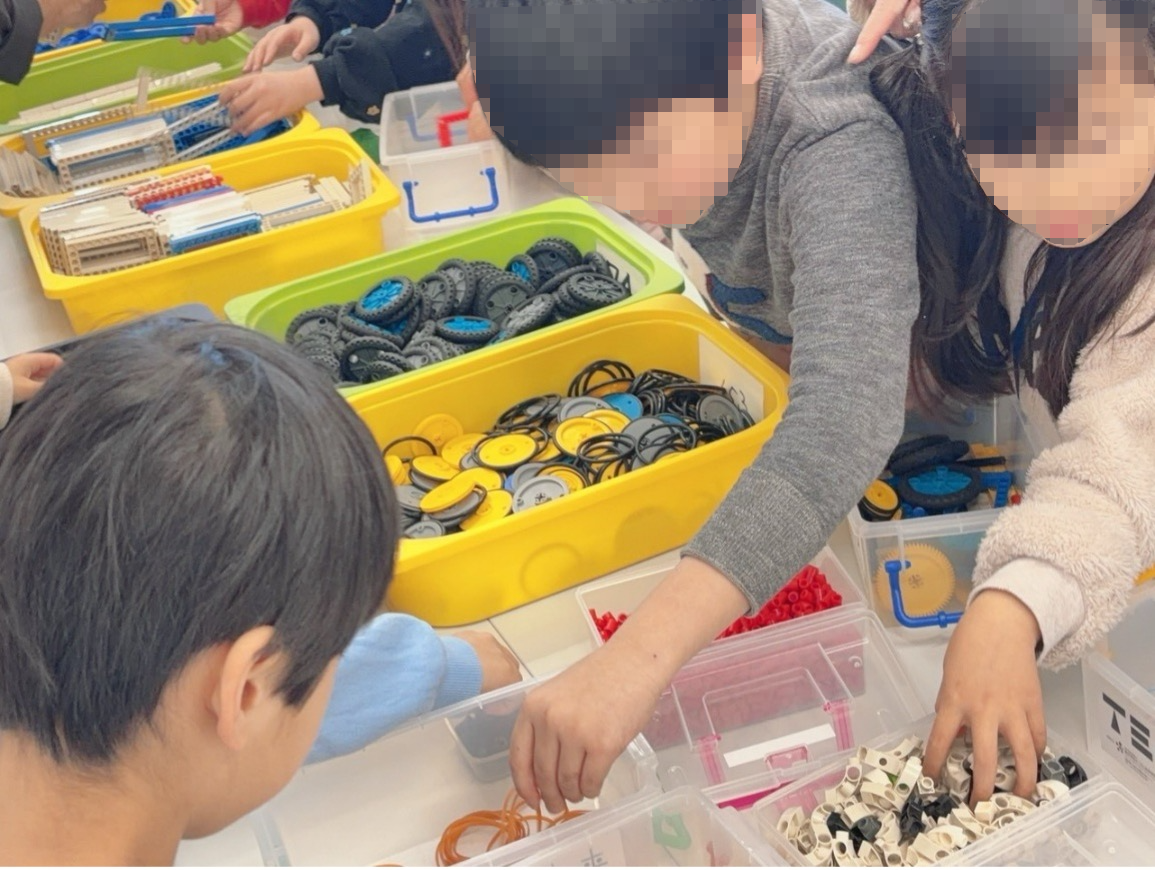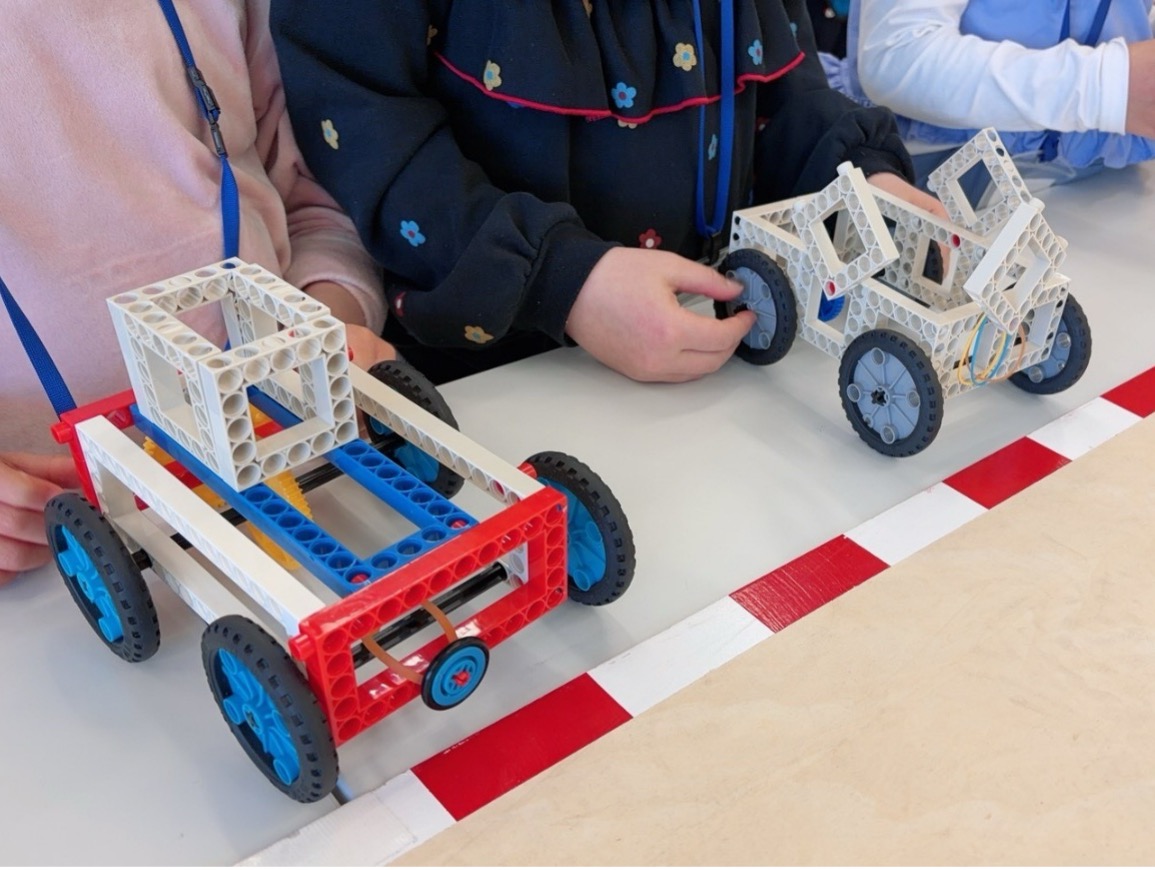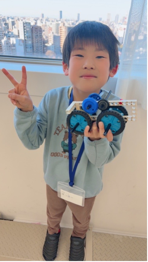 曲線ブロックをうまく使いながら、丸みをおびた車を作る子もいれば、四角を組み合わせてできるだけ大きなボディを作ろうとする子、タイヤの数も4輪だけでなく、6輪に挑戦する子など本当に様々な「思い(工夫)」が見られました。形や大きさは違いますが、「自分の思い」が込められている点は皆共通です。思いを実現させるために自然と作業にも熱が入ります。