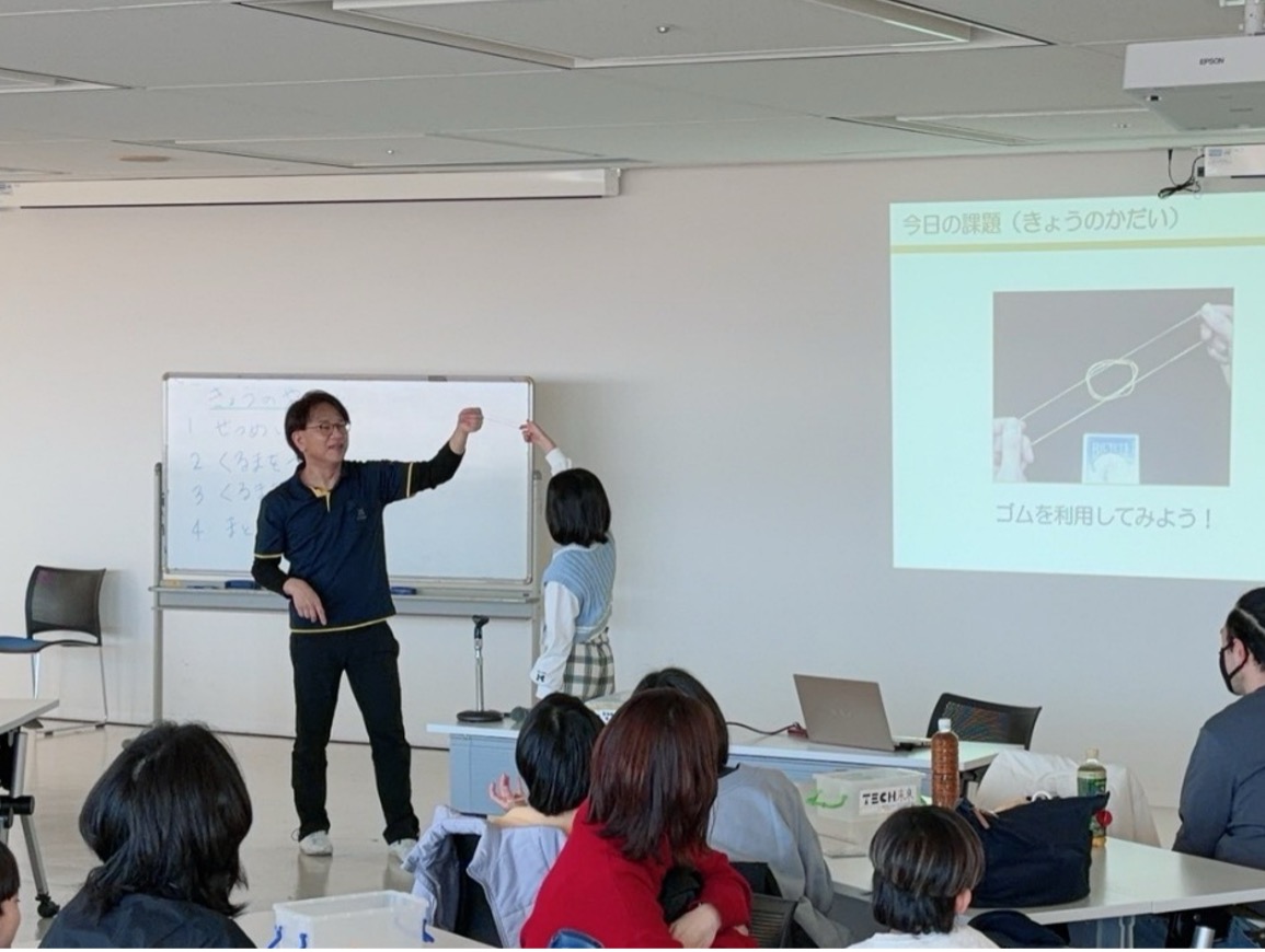 3月8日(日)に墨田区教育委員会事務局地域教育支援課主催「親子で楽しむSTEAM教室」にて、墨田区内に在住・在学の⼩学校1〜3年⽣とその保護者を対象としたゴム動力カーのワークショップを行いました。