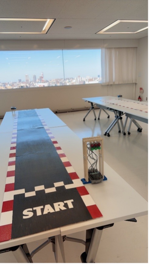 今回は完成したゴム動力カーを走らせるコースに、新たに制作したコースも追加しました。毎度おなじみのプログラミング済みのスタートシグナルも大好評で、子供たちの挑戦への意欲を駆り立てます。車が完成したら、「コースをまっすぐ走らせること」、「できるだけ速くゴールすること」など新しい次の目標を立てて、挑んでいました。